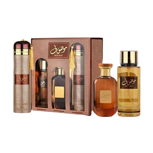 Mousuf Gift Set Delivered in a beautiful packaging, this gift box contains a 100ml bottle of perfume, a 250ml body mist and a 300ml home fragrance. With this gift box your friends will appreciate your taste and attention.